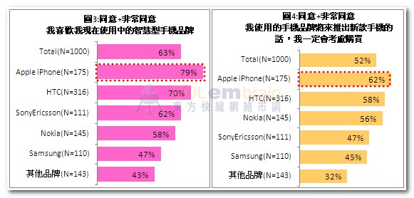進一步詢問各廠牌手機滿意度,其中以Apple iPhone使用者(79%)對手機的滿意度最高,第二則是HTC(70%)(見圖3)。而目前使用手機品牌若推出新手機,一定會考慮購買的也是iPhone族(62%),其次則是HTC(58%)(見圖4)。顯示Apple iPhone與HTC都能抓住使用者的心,創造出屬於自己的死忠支持者。