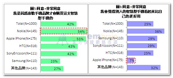 在智慧型手機品牌偏好度與購買的相關程度上,以Nokia使用者比例最高(54%)、其次為Apple iPhone(53%)(見圖5)。然而Nokia的使用者認為別人的智慧型手機比自己的更好用的比例也較高(36%)。而iPhone使用者多半非常支持Apple,認為別人手機比較好用的比例僅有7%,顯見蘋果深深抓住消費者的心(見圖6)。