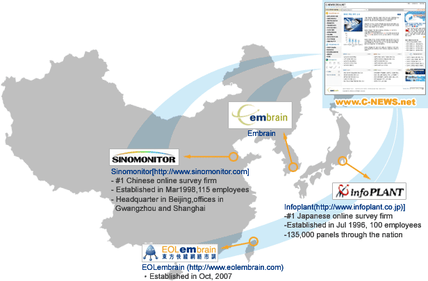除了台灣地區外, EOLembrain 亦加入包含韓國、日本及中國當地主要網路調查公司策略聯盟成立的 C-News Asia Network, 不只每年定期在四個國家同時進行消費者調查及發佈調查結果 , 亦提供客戶進行東北亞地區跨國性調查研究服務。